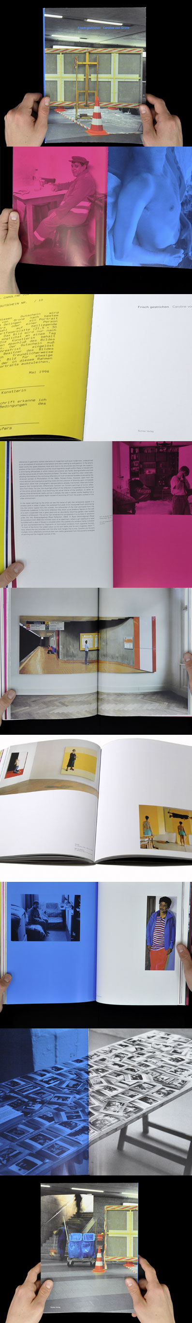 das buch umfasst neben der malerei, auch das aktionistische werk der künstlerin, das in form von kollagen oder fotos dokumentiert wird. projekte werden visuell getrennt, in dem seiten in cyan, magenta und gelb dazwischen geschaltet werden.